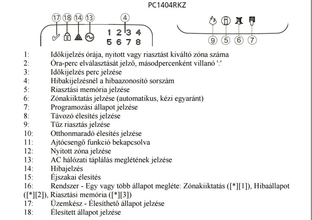 - 8: Rendszeridő ás dátum elvesztése. Habár nincs digitális kijelzője a kezelőegységnek, a riasztórendszer naplója miatt szükséges a pontos idő és dátum beállítás. Karbantartás szükséges amennyiben rövidebb áramszüneteket sem képes áthidalni a rendszer.